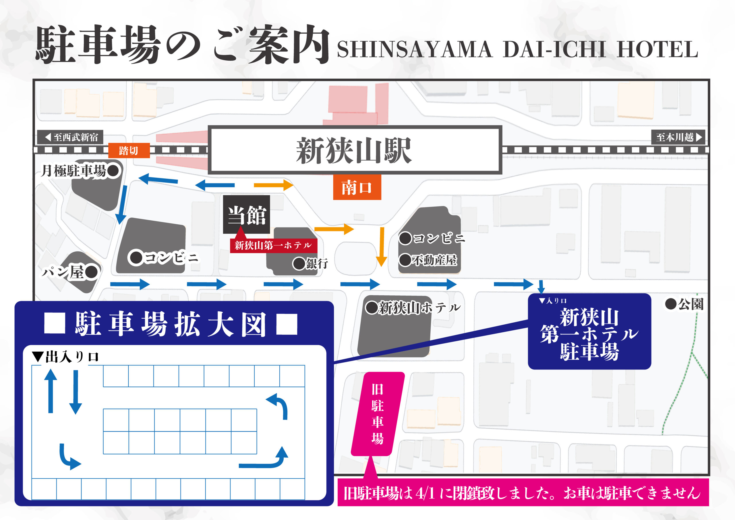 なお、満車の際は別の駐車場をご案内いたしますので、一度フロントにお立ちより下さい。※【新狭山第一ホテル専用駐車場】GoogleMAPで確認:GoogleMAP
